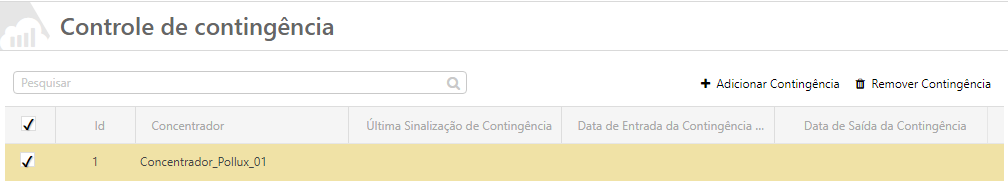 O objetivo do controle de contingência é adicionar ou remover concentradores da contingência manualmente, onde para realizar estas ações o usuário deverá selecionar um ou mais concentradores apresentados na tela e clicar no botão +Adicionar Contingência ou em Remover Contingência.