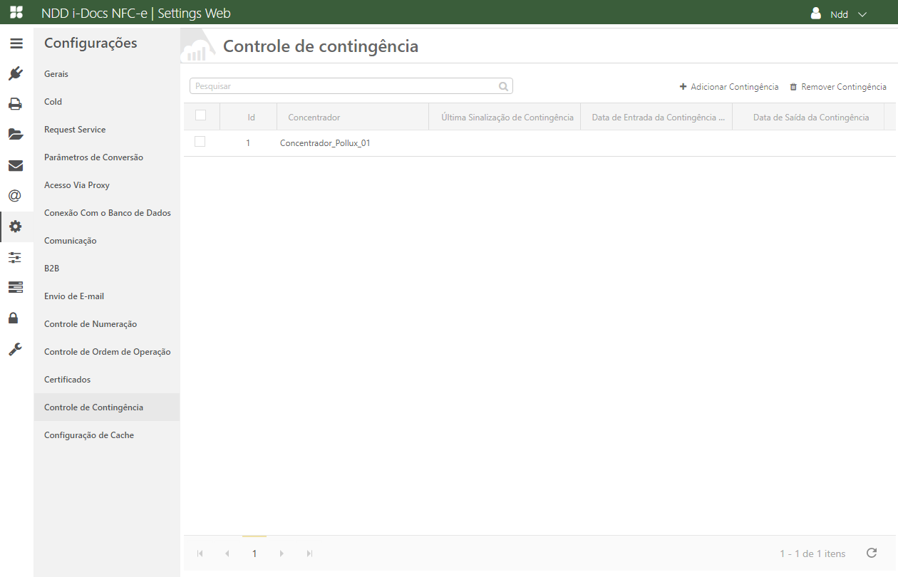 Acesse o e-Connector Settings e na área de configurações, clique em Controle de Contingência. A seguinte tela é apresentada: