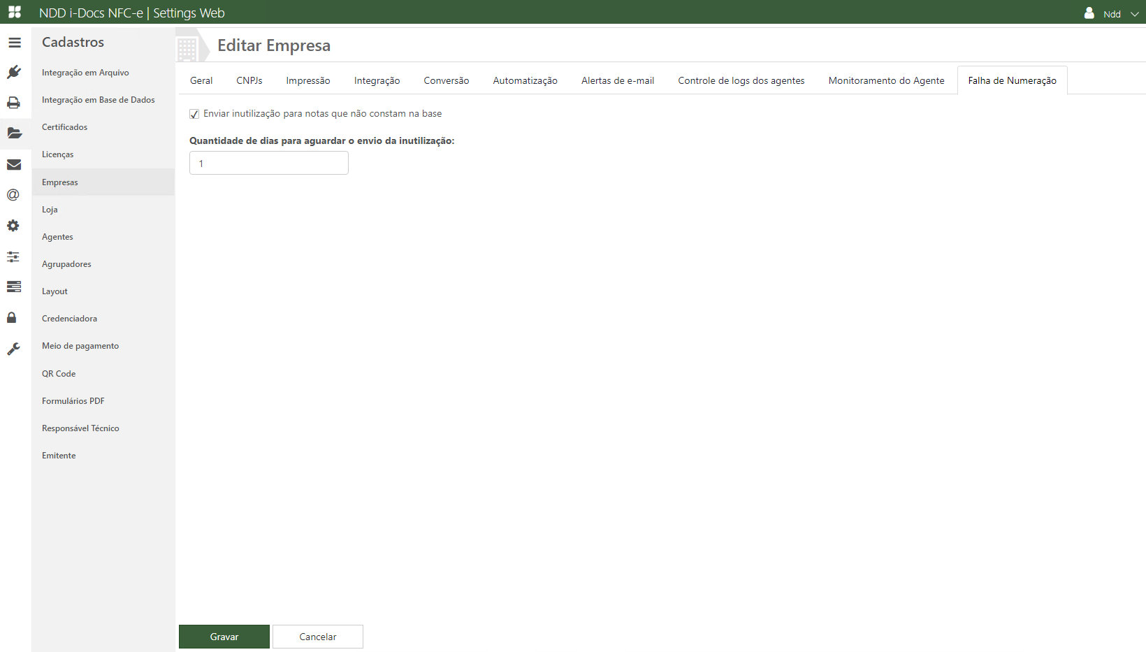 ✓Quantidade de dias para aguardar o envio da inutilização: Quantidade de dias em que o documento permanecerá na aba de falha de numeração do e-Monitor, aguardando o processamento da Inutilização automática.