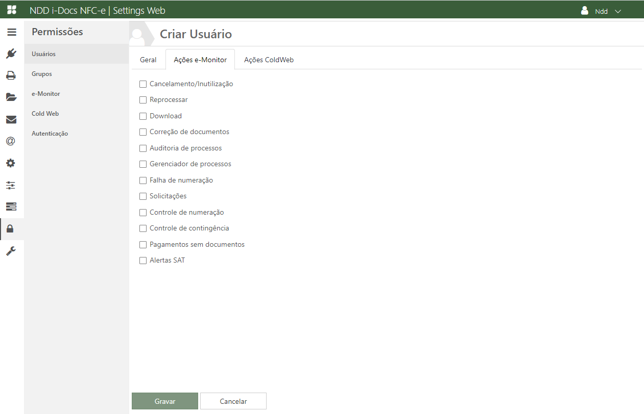 Marque as ações que este usuário irá possuir ao acessar o e-ColdWeb.