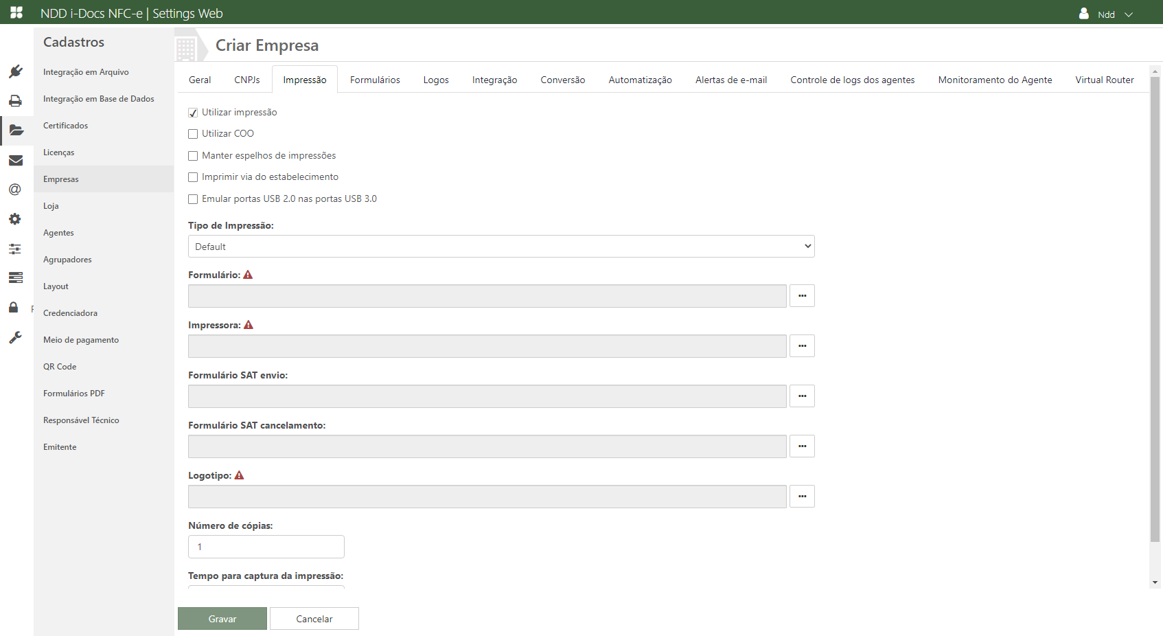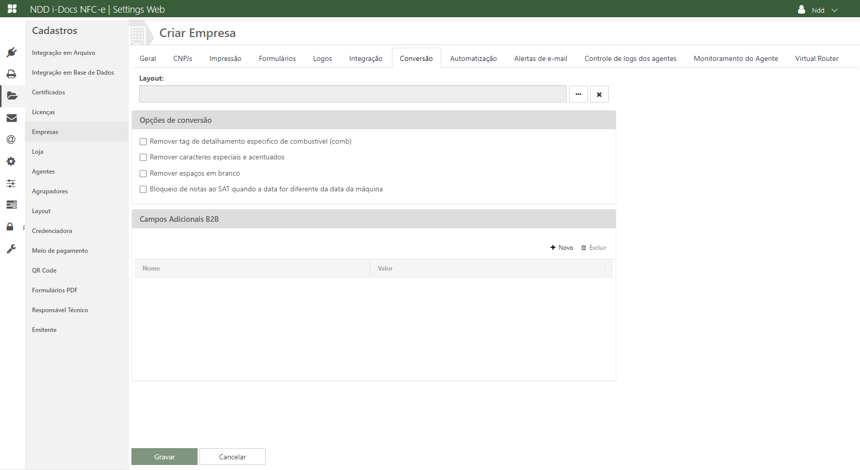 Acesse o e-Connector Settings e na área de cadastros, clique em Empresas. A seguinte tela é apresentada: