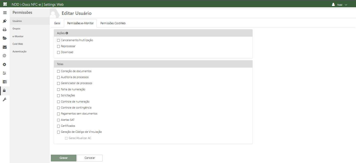 Marque as ações que este usuário irá possuir ao acessar o e-ColdWeb.
