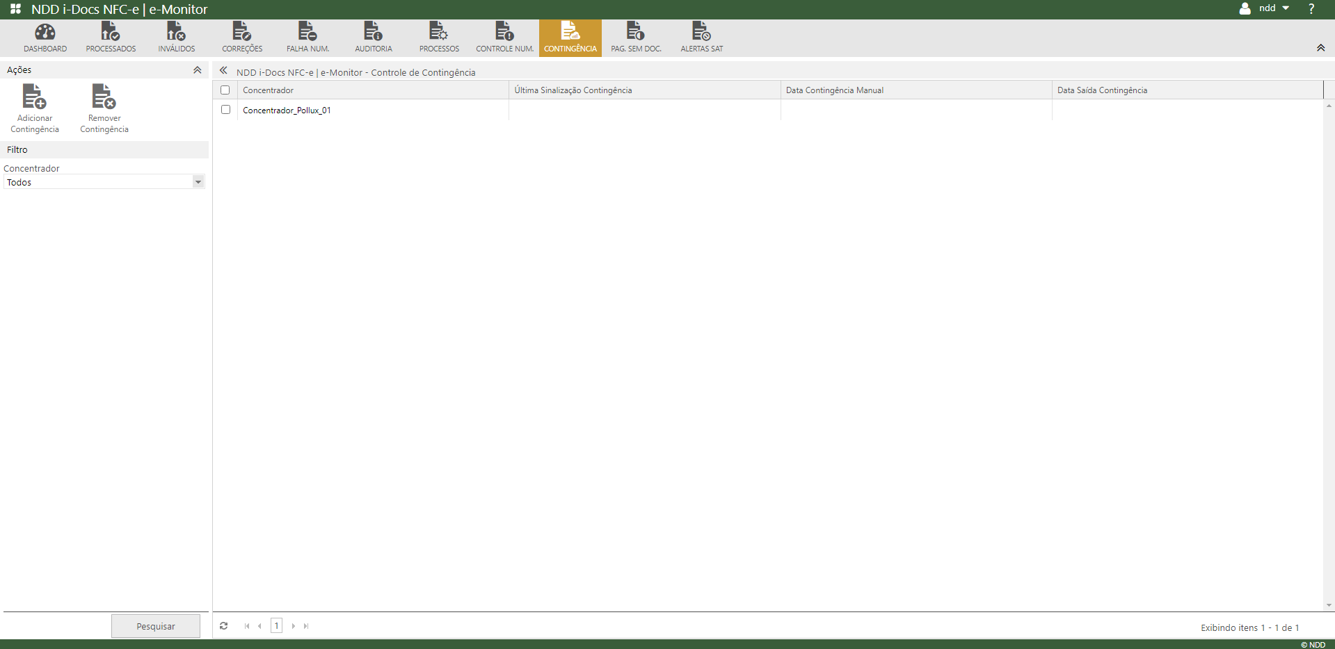 Nesta aba será possível adicionar ou remover concentradores da contingência manualmente, onde os concentradores só serão apresentados caso os mesmos possuam permissão para o usuário/grupo logado.