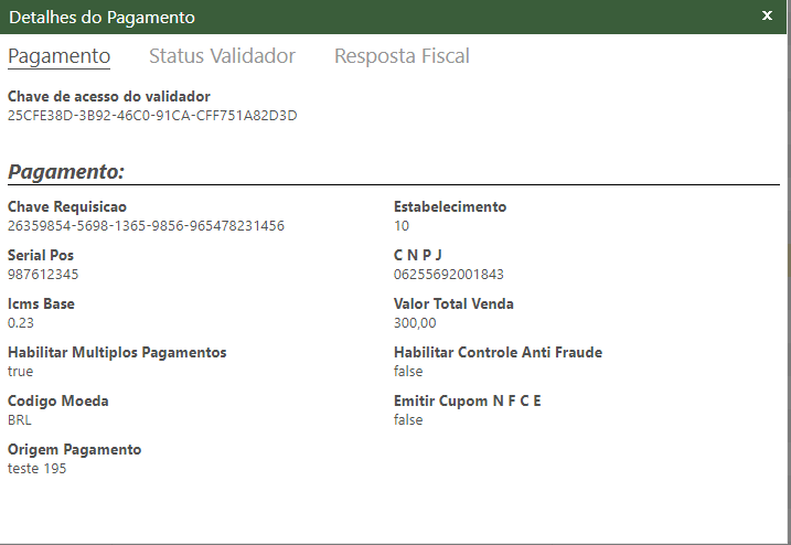 Para visualizar os detalhes do pagamento, deve ser realizado duplo clique sobre o registro desejado, onde a seguinte tela é apresentada.