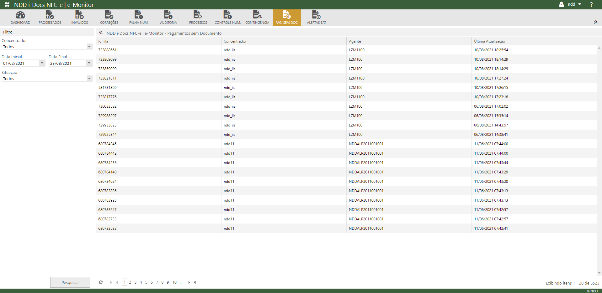 ✓ Situação: Selecione a situação em que o documento que deseja pesquisar encontra-se, os quais podem ser igual a: sem pagamento, sem status pagamento, sem status validador e sem resposta fiscal ;