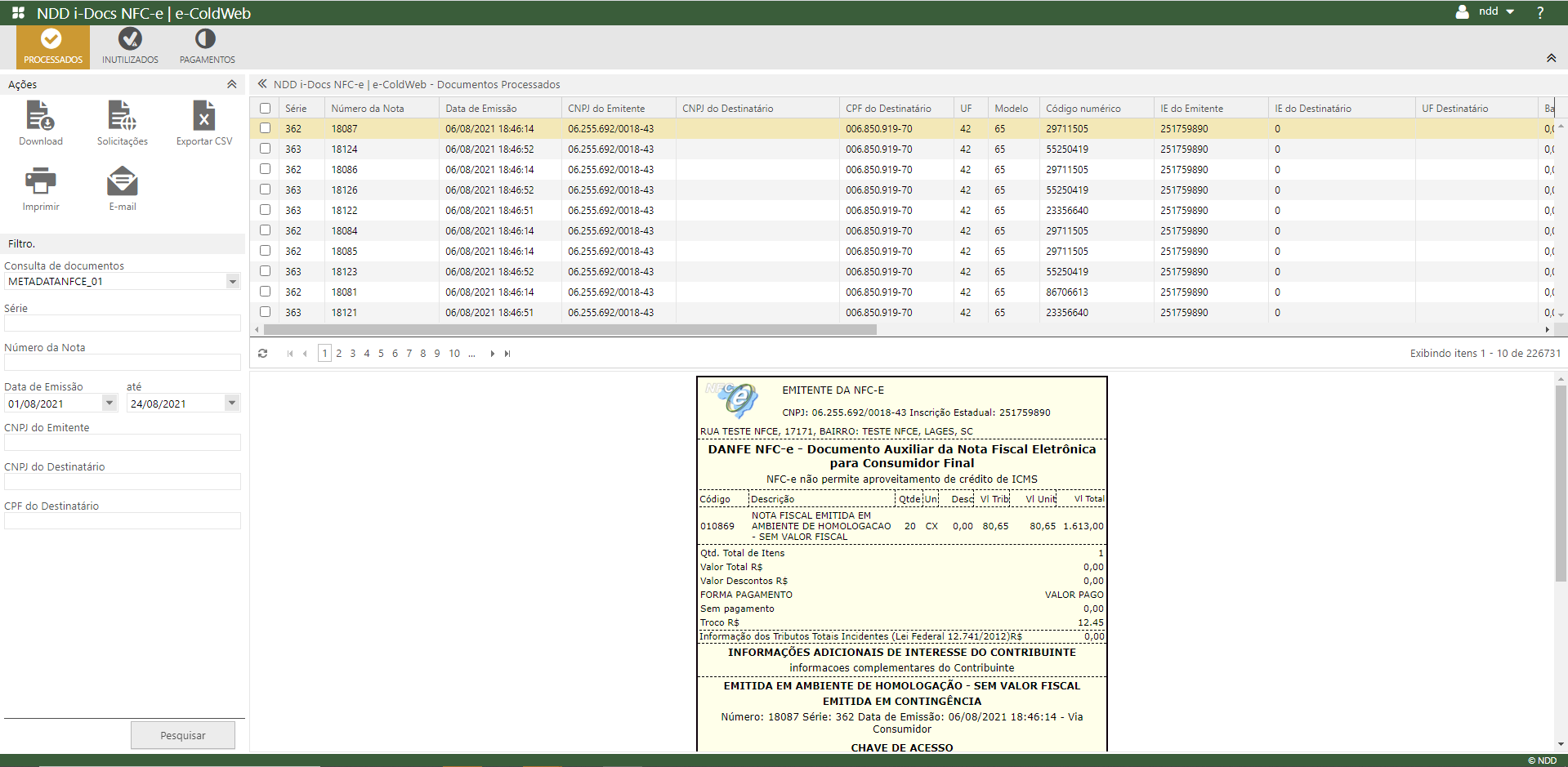 Nesta aba são exibidos todos os documentos processados e inseridos em Cold, onde os dados informados na massa são apresentados de forma resumida através das colunas.