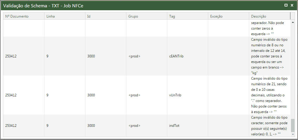 Clicando duas vezes sobre um dos registros é apresentado a validação do schema, onde é mostrado de forma detalhada as inconsistências do documento, conforme imagem abaixo.