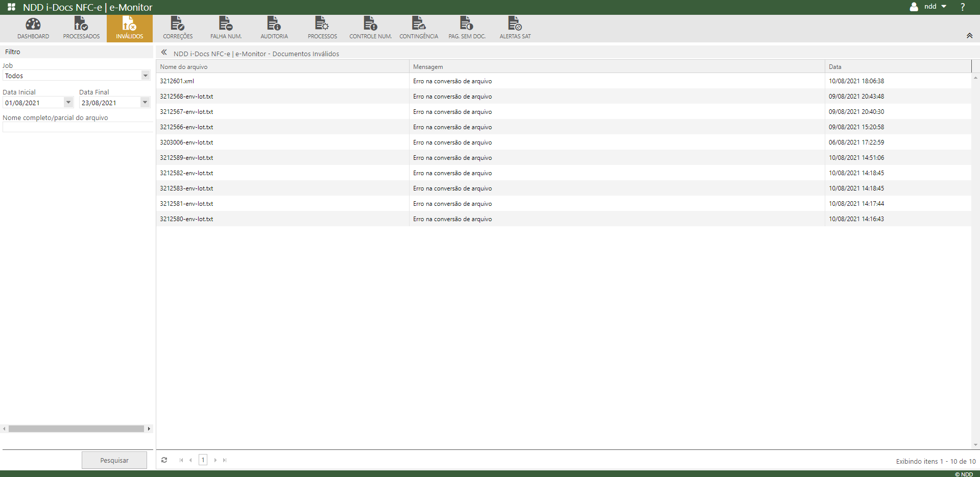 Ao clicar em INVÁLIDOS, a seguinte tela é apresentada, onde é exibido todos os documentos que apresentaram problemas no momento da validação.