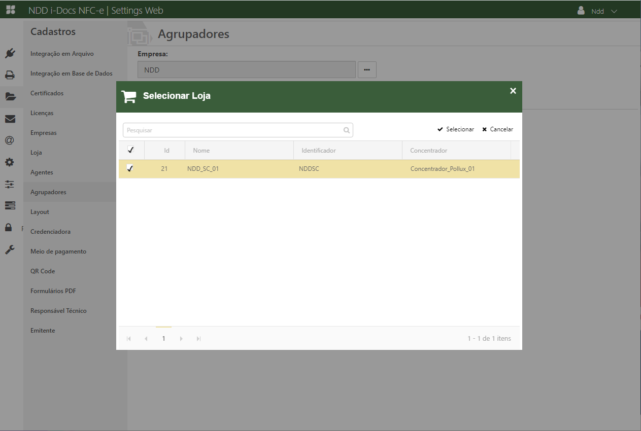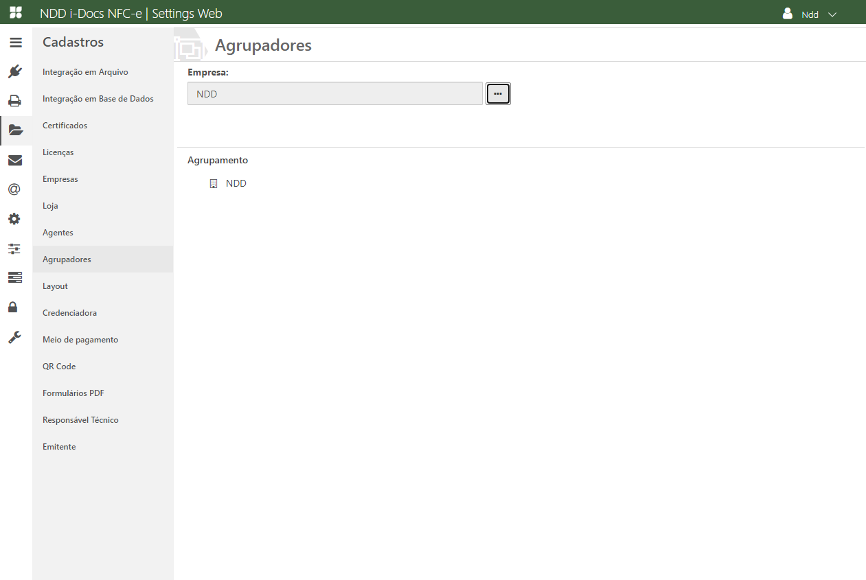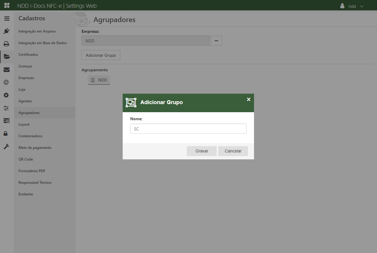 Acesse o e-Connector Settings e na área de cadastros, clique em Agrupadores. A seguinte tela é apresentada: