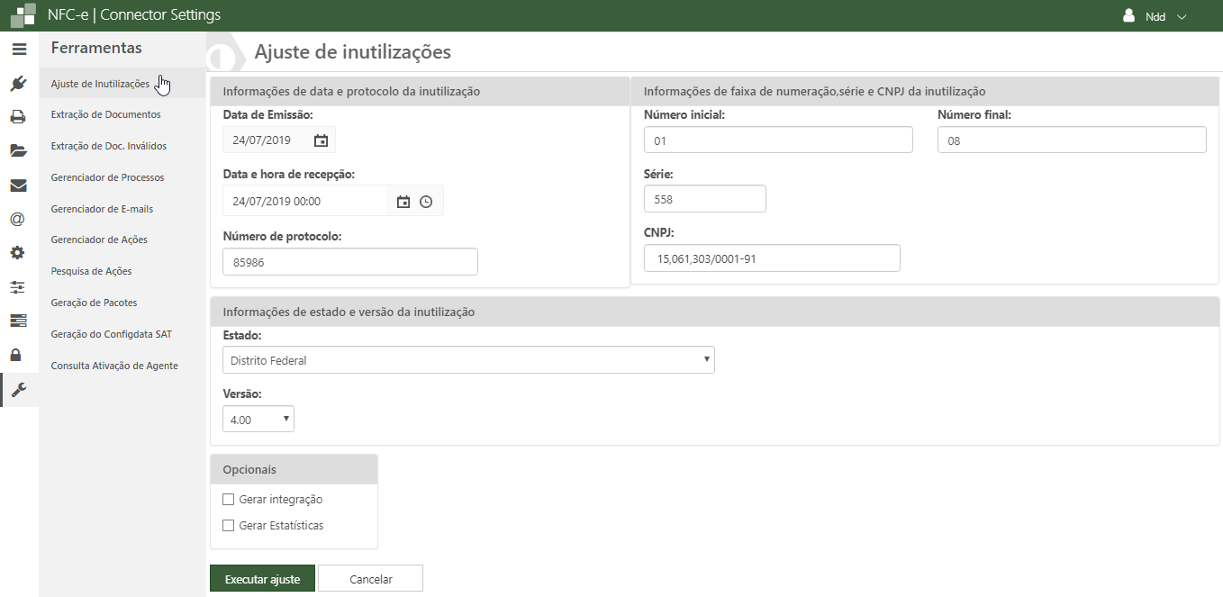 Clique em Executar ajuste para realizar o processo de ajuste de inutilização dos documentos, conforme valores configurados.