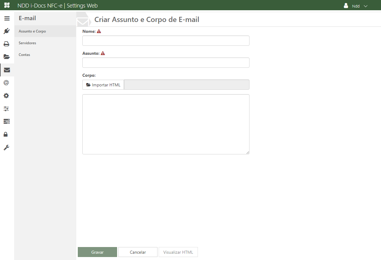 ✓ Corpo: Selecionar o arquivo no formato e extensão HTML, quando selecionado será apresentado o HTML selecionado no campo abaixo.