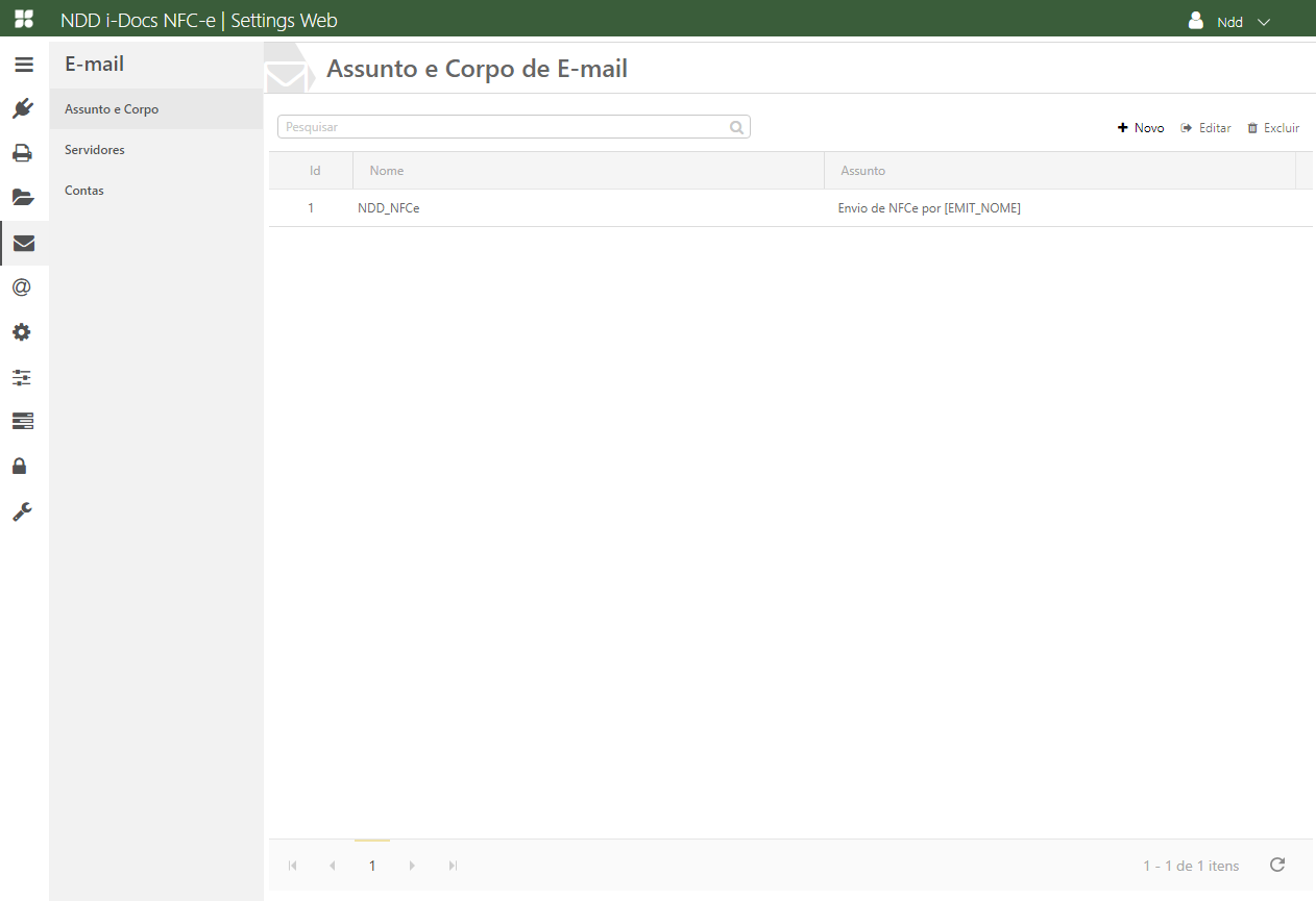 Para cadastrar um novo assunto e corpo de e-mail clique em +Novo. Será exibida a tela para cadastro dos dados, preencha-os conforme descrito abaixo.