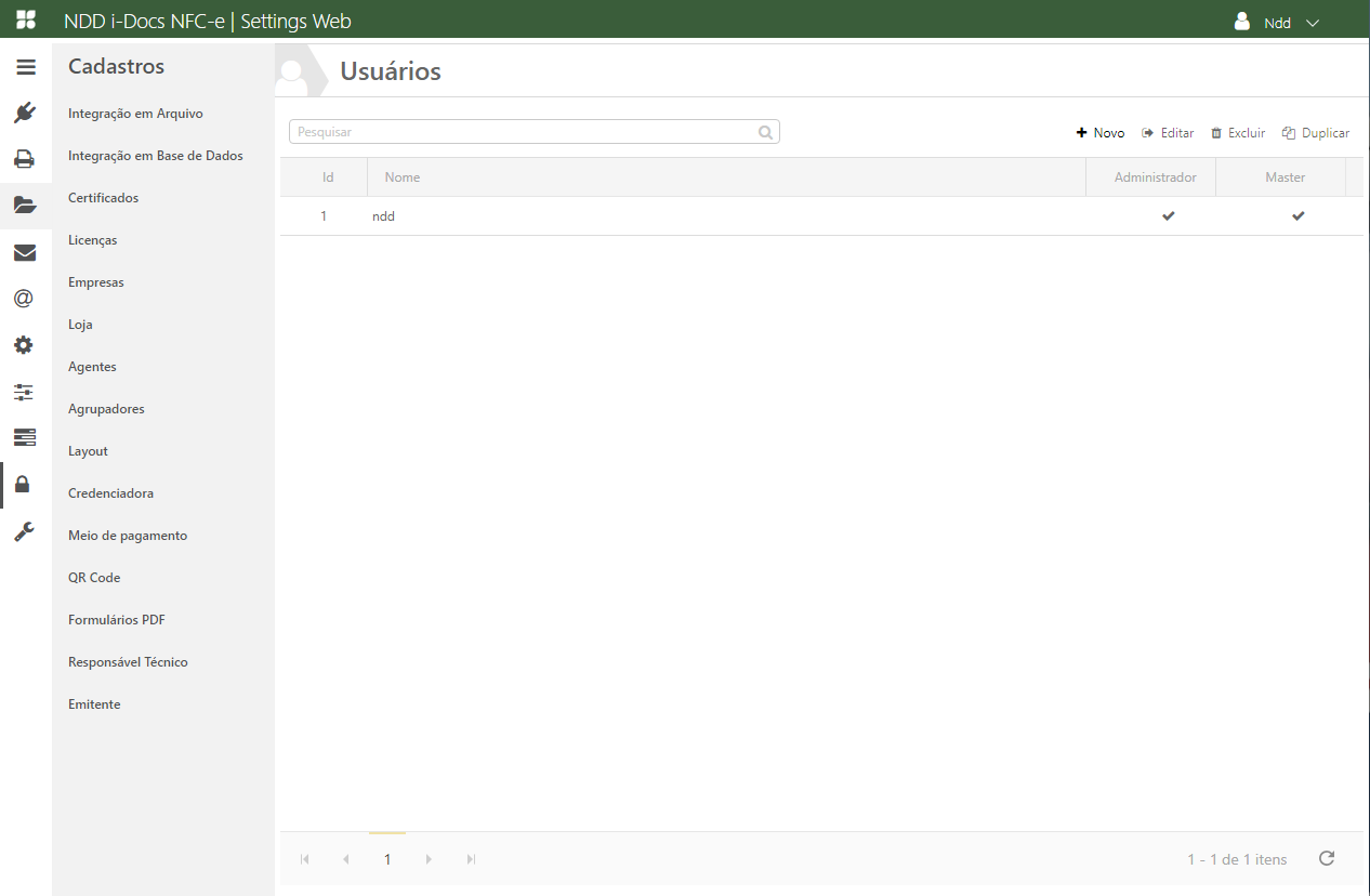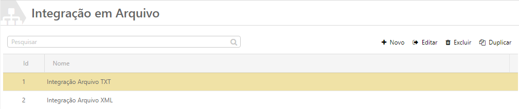 Acessando esta área, será possível criar um Novo registro, Editar, Excluir ou Duplicar os registros. Para isso, todas as telas seguem o mesmo padrão, onde deve sempre ser selecionado um registro para que as opções destacadas na imagem a seguir sejam habilitadas, com exceção da ação +Novo.
