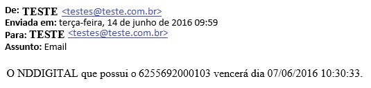 Exemplo de conteúdo de e-mail de Vencimento de Certificado após recebimento: