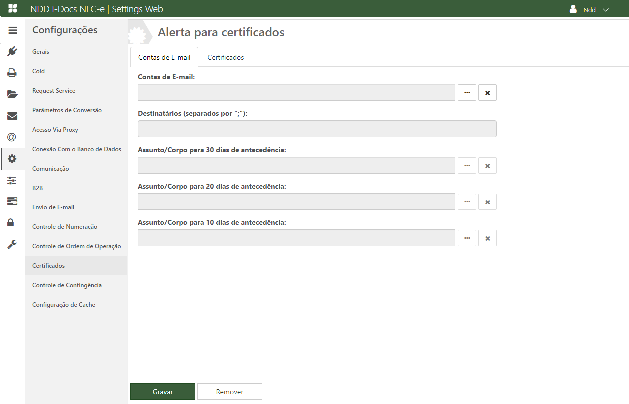 ✓ Contas de e-mail: Selecione a conta de e-mail a ser utilizada para enviar alertas, caso haja algum certificado prestes a expirar;