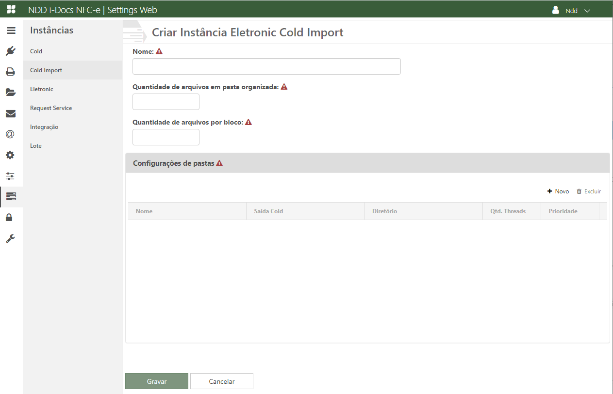 Nesse segmento será possível adicionar as pastas que o serviço do Cold Import fará o processo de inserção no Cold. Ao clicar em +Novo é apresentado na tela os campos necessários para o cadastro, preencha conforme descrito abaixo.