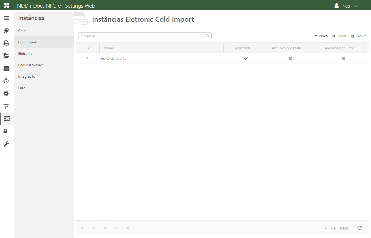 Para cadastrar uma nova instância Cold Import clique em +Novo. Será exibida a tela para o cadastro, preencha conforme descrito abaixo.