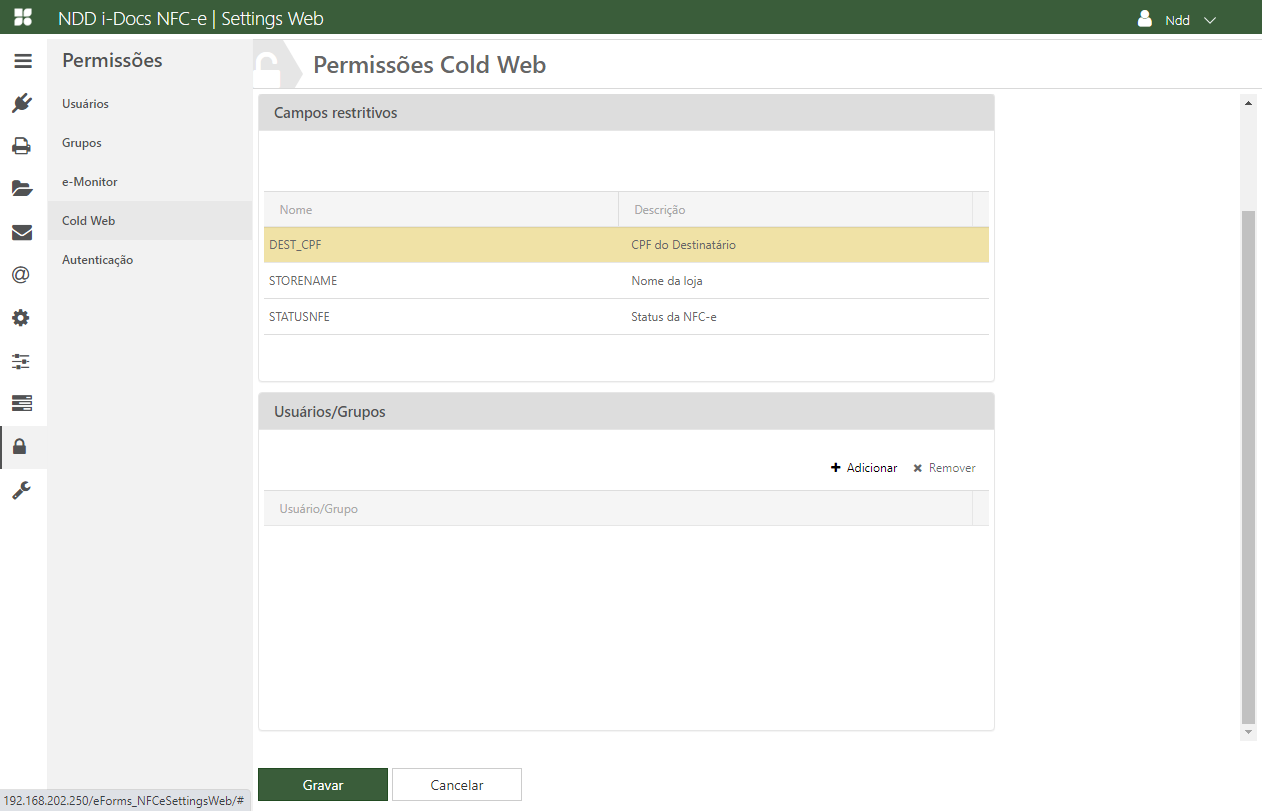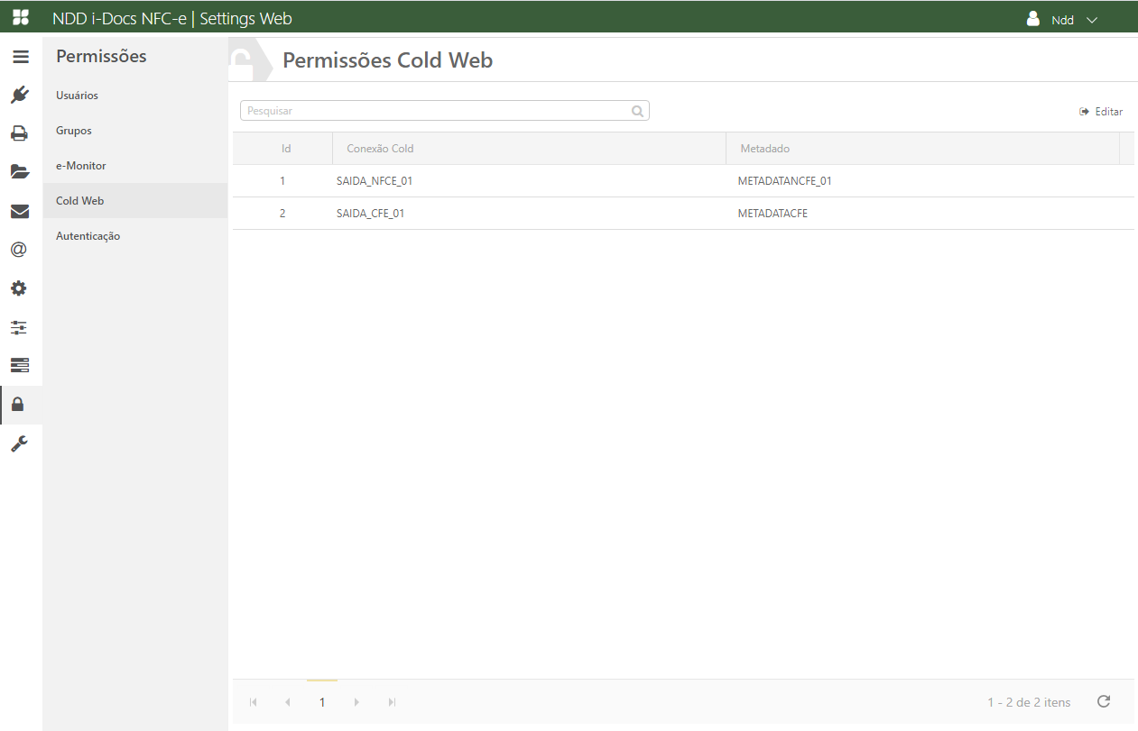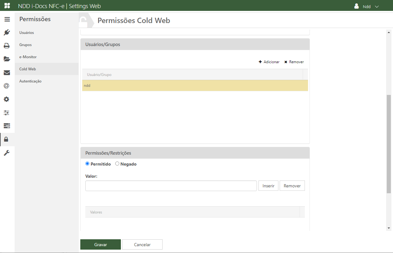 Acesse o e-Connector Settings e na área de Permissões, clique em Cold Web. A seguinte tela é apresentada: