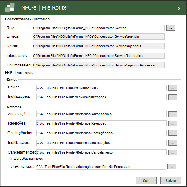 Inutilizações:  Diretório de Inutilizações do ERP. Os arquivos que forem inputados nesta pasta serão automaticamente enviados para o diretório "Envios" do Concentrador.