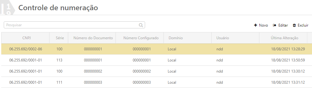 Ao selecionar um registro e clicar em excluir, será removido apenas o número configurado para a série e CNPJ, ou seja, não é removido o controle de numeração e sim a configuração. Caso não haja número configurado será considerado o número do documento, o qual é o último documento processado na base para a série e CNPJ do processamento em questão. |