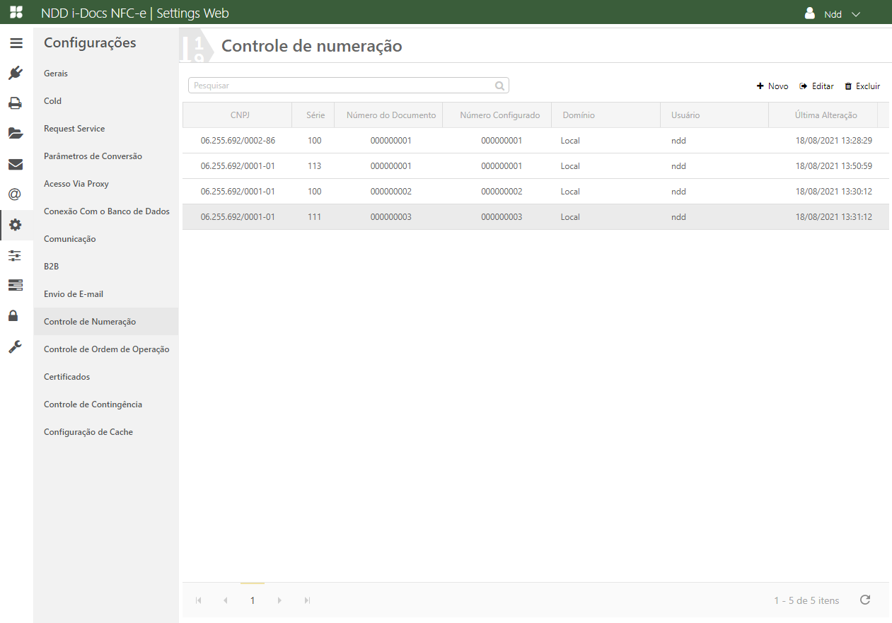 Acesse o e-Connector Settings e na área de configurações, clique em Controle de numeração. A seguinte tela é apresentada: