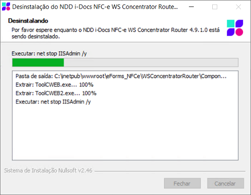 Desinstalação do Módulo Web Services Concentrator Router NFC-e: para desinstalar, acesse o menu Iniciar>Programas>NDDigital e-Forms NFC-e>WS Concentrator Router>Uninstall. Para prosseguir, siga os passos abaixo: