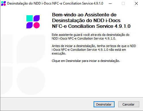 Tela inicial: Tela inicial da desinstalação do Conciliation Service. Para prosseguir, clique em Desinstalar.