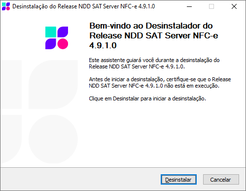 Tela inicial da desinstalação do Multi SAT NFC-e. Para prosseguir, clique em Desinstalar.