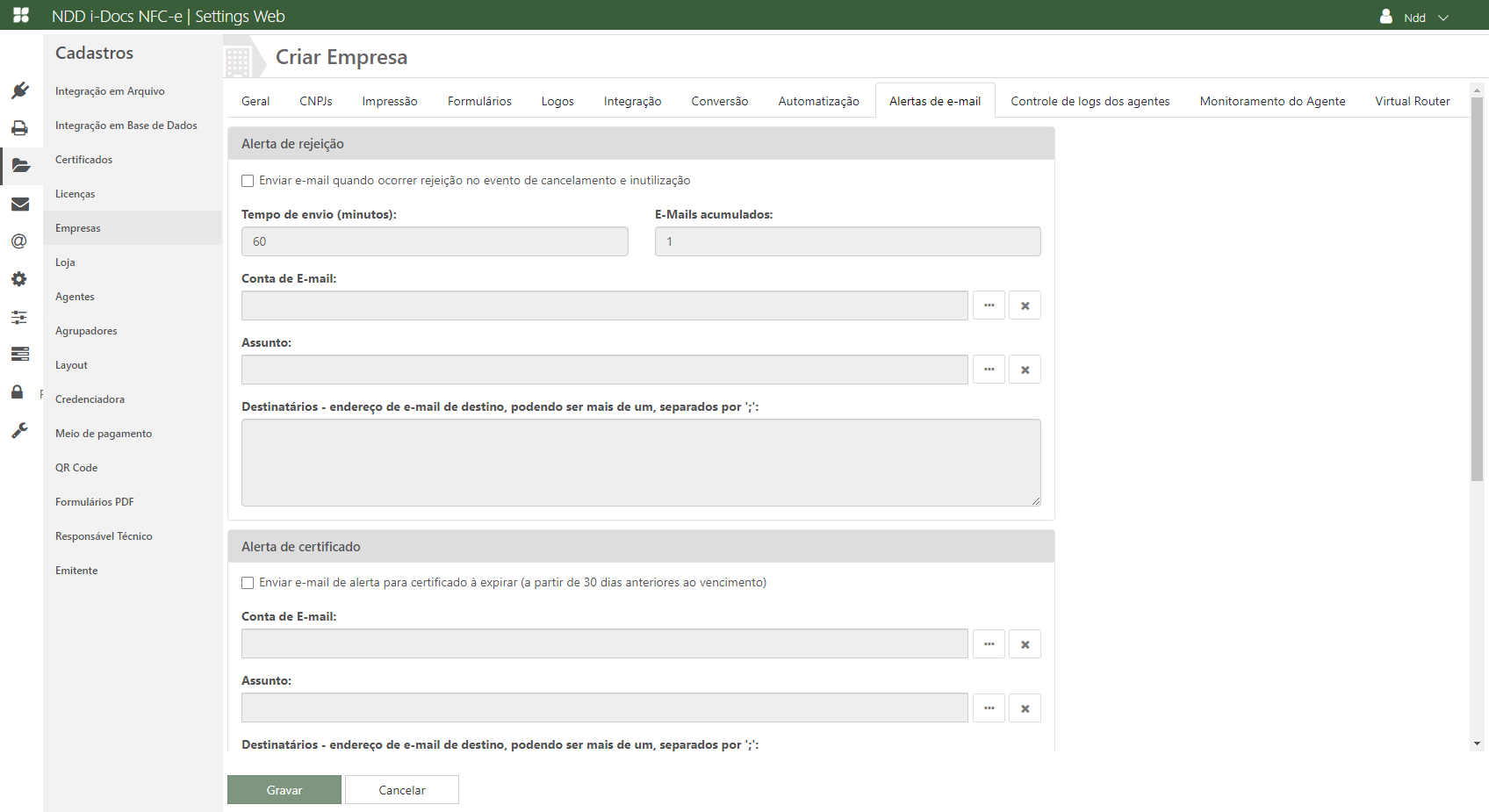 ✓ Enviar e-mail de alerta para Certificado à expirar (a partir de 30 dias anteriores ao vencimento): Marque este checkbox para receber via e-mail cadastrado abaixo, alertas para Certificados à expirarem (a partir de 30 dias anteriores ao vencimento) cadastrados a empresa selecionada;