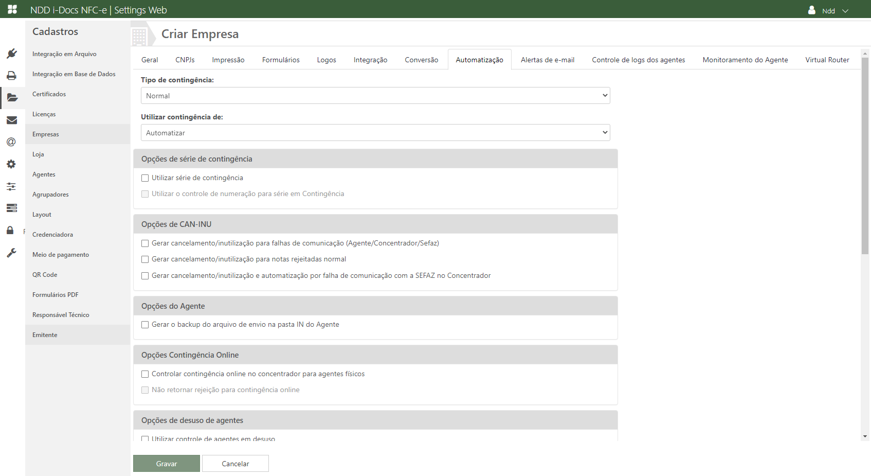 o Automatizar - O sistema entrará automaticamente em contingência, alterando o tipo de emissão de Normal (1) para Contingência (9);