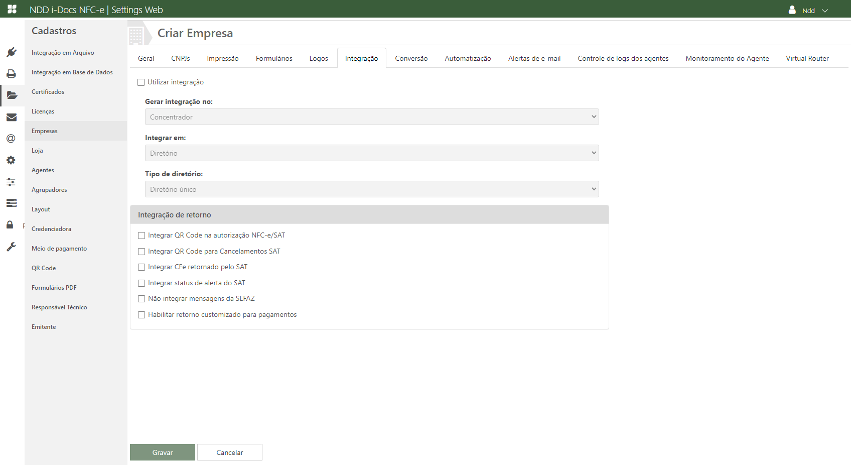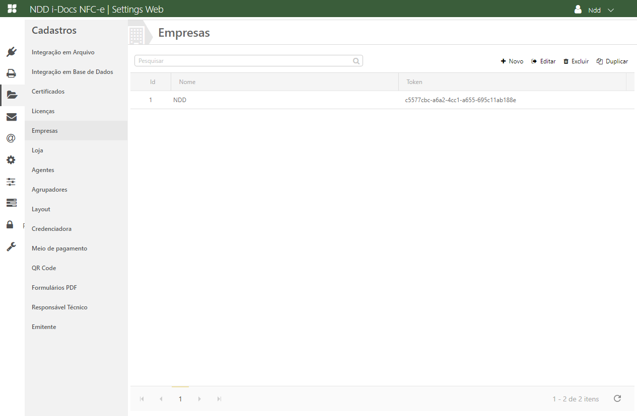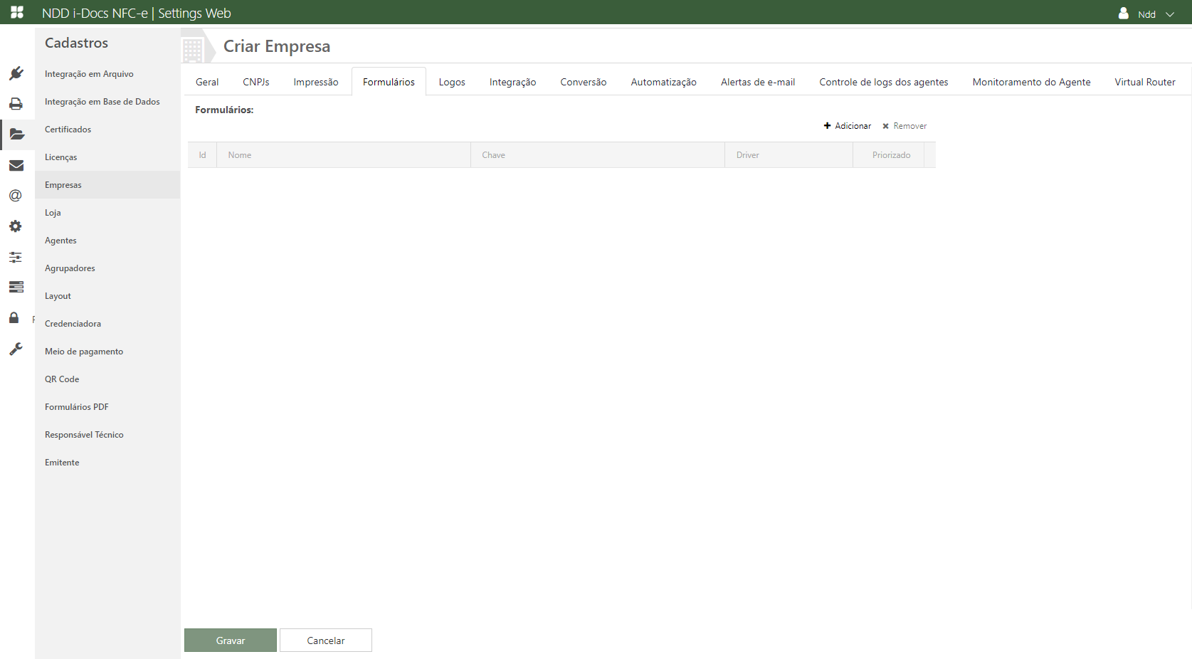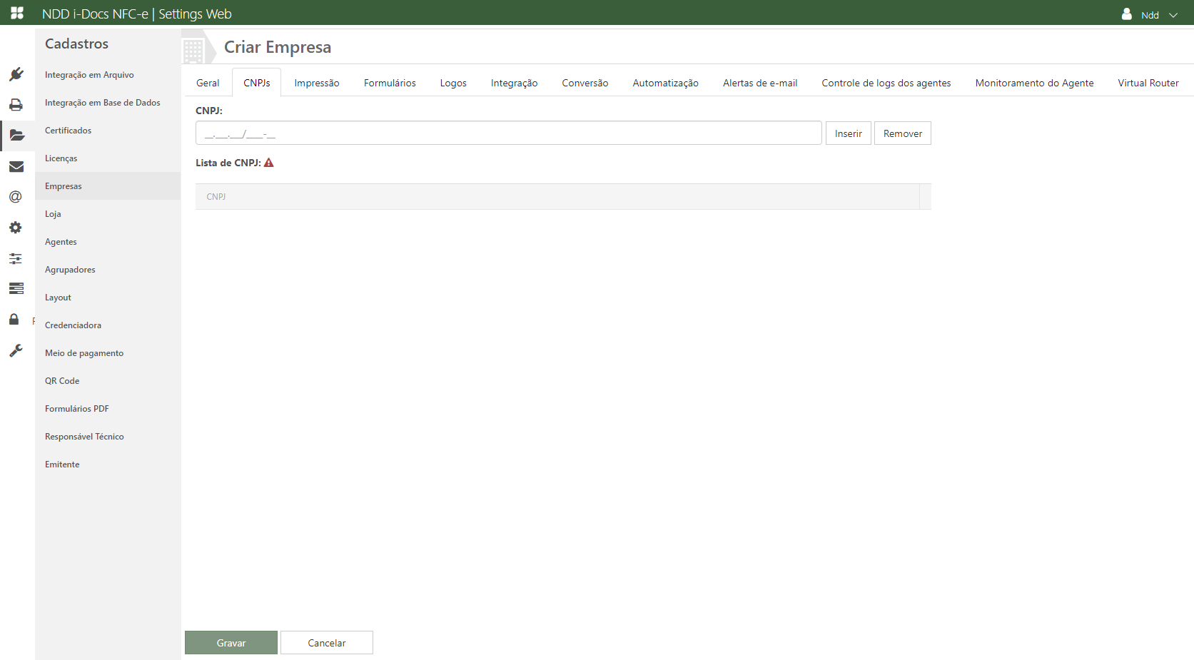 Acesse o e-Connector Settings e na área de cadastros, clique em Empresas. A seguinte tela é apresentada: