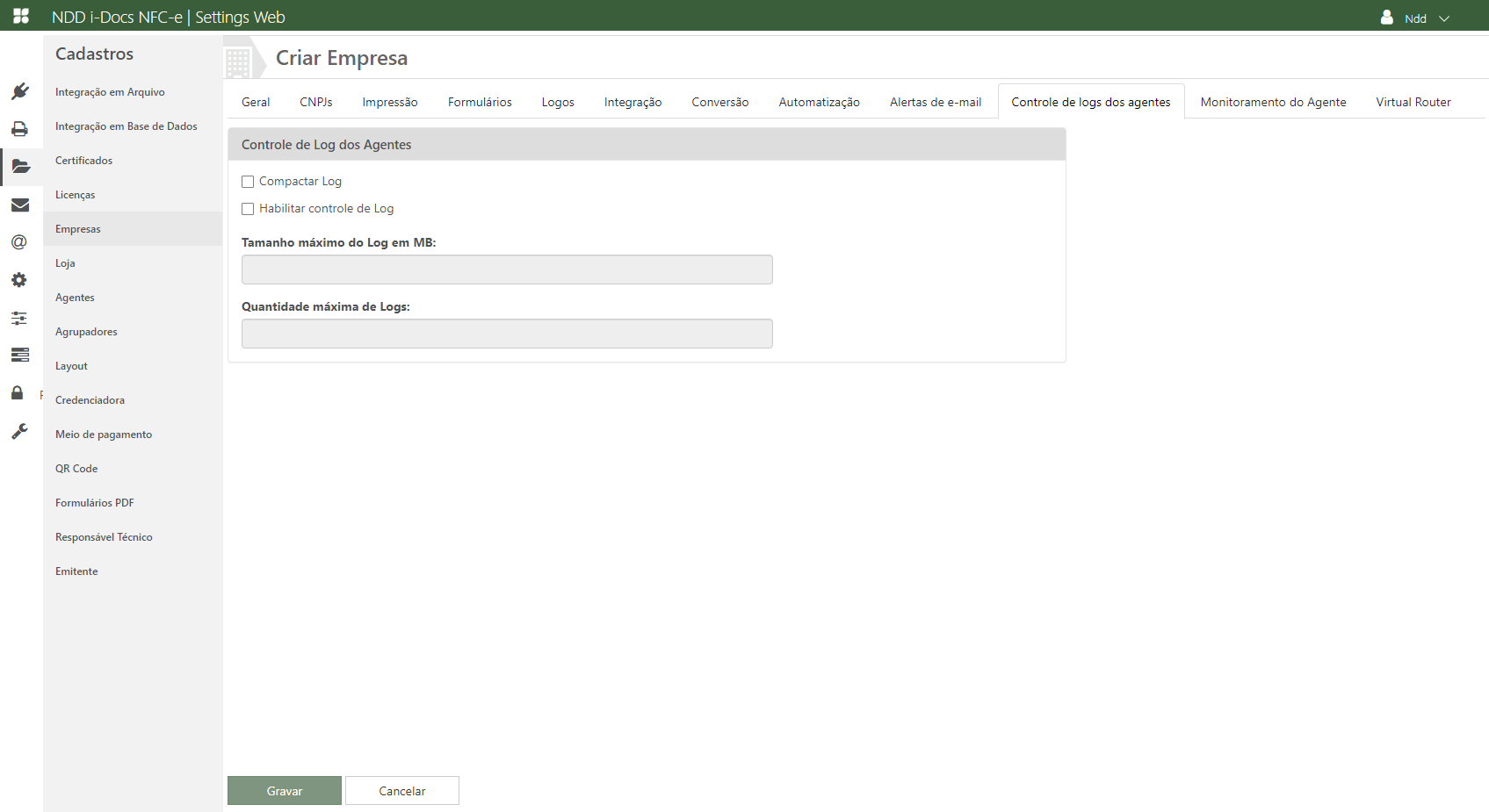 ✓Habilitar controle de log: Habilite esta opção caso deseje alterar os valores default dos logs dos Agentes.