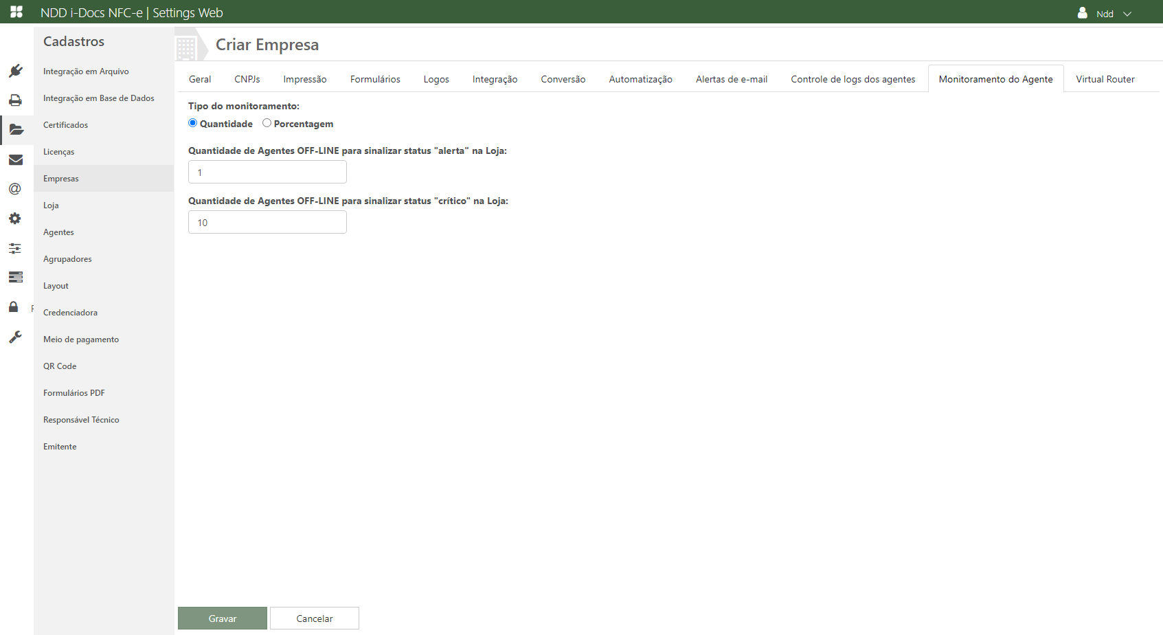 Através desta aba é possível configurar o monitoramento dos Agentes. As opções cadastradas aqui serão mostradas no Dashboard do e-Monitor.