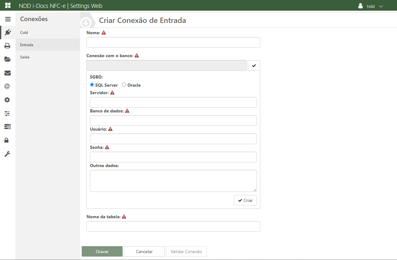 Após preencher todos os campos necessários, clique em Validar Conexão, se os dados estiverem corretos clique em Gravar.