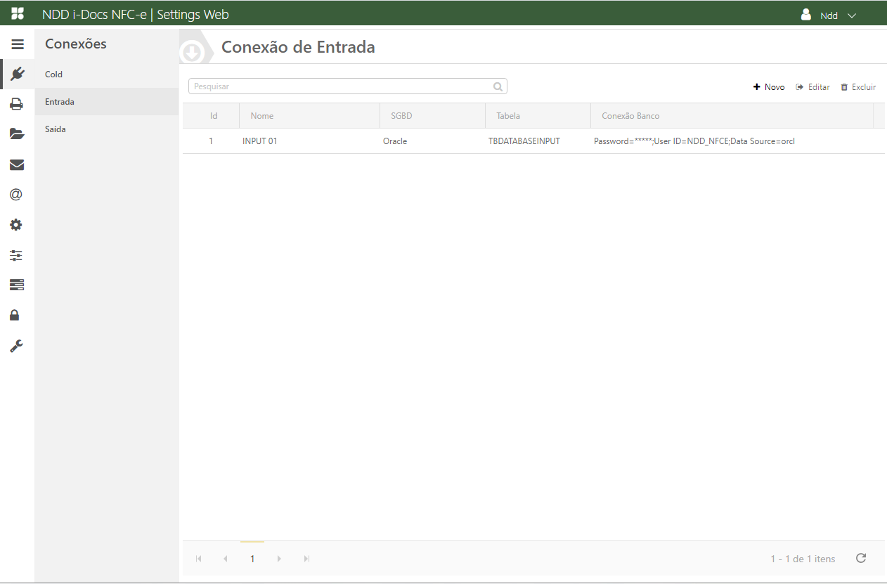 Acesse o e-Connector Settings e na área de conexões, clique em Entrada. A seguinte tela é apresentada: