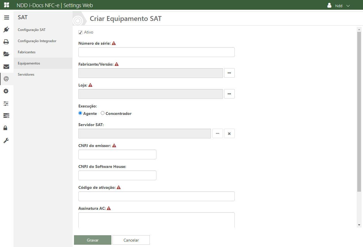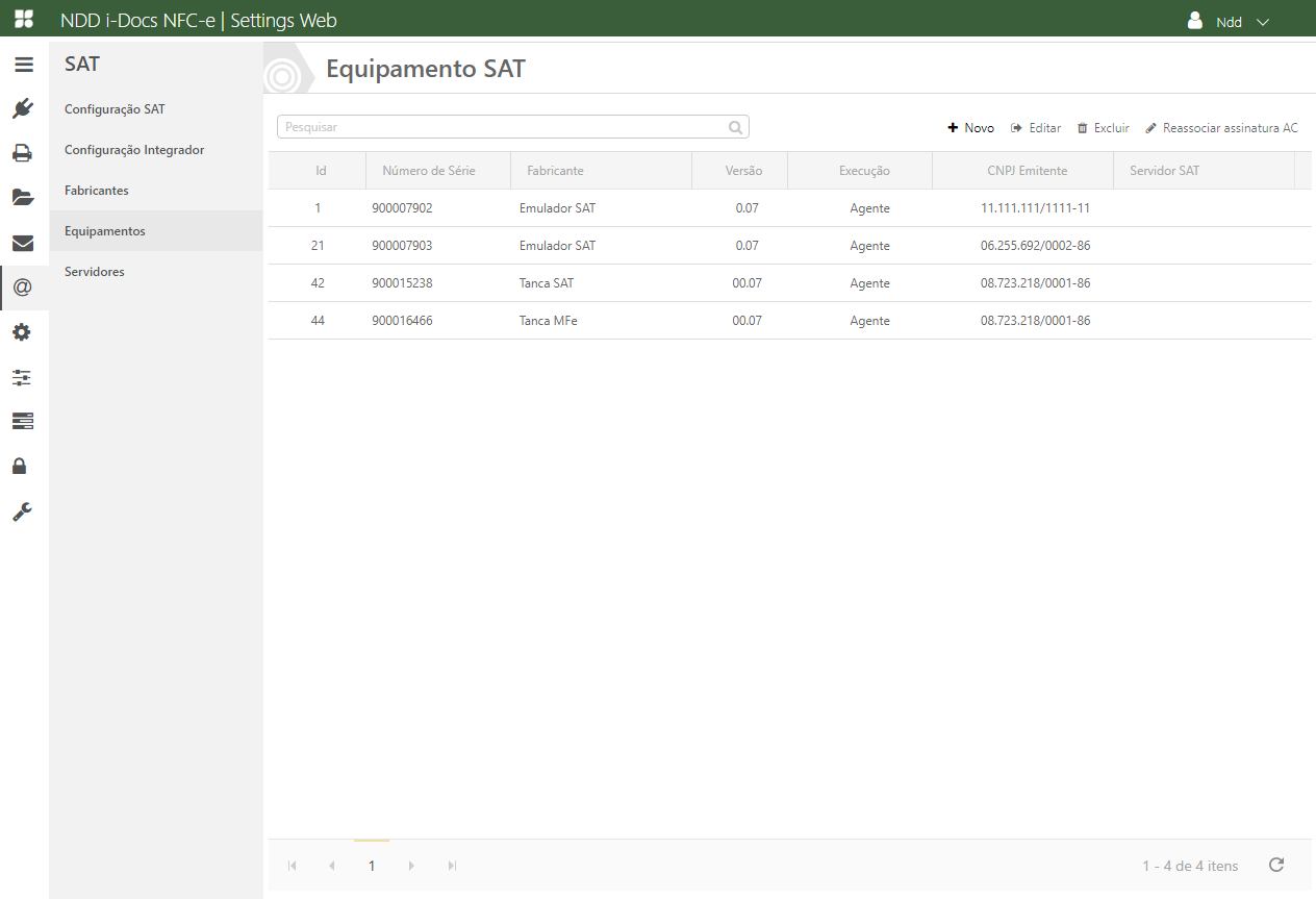 Acesse o e-Connector Settings e na área de SAT, clique em Equipamentos. A seguinte tela é apresentada:
