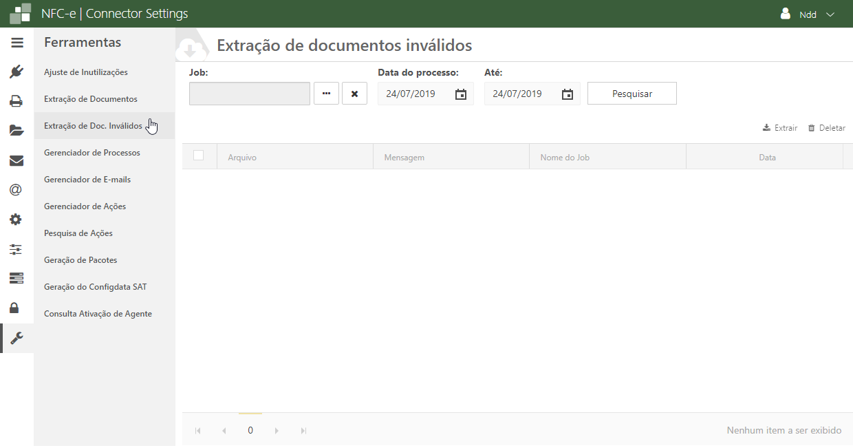 Selecione o Job desejado e informe a data inicial, a data final do processo, após isso clique em PESQUISAR. Será apresentado todos os documentos inválidos, selecione os documentos desejados e clique no botão EXTRAIR ou DELETAR, caso necessário.