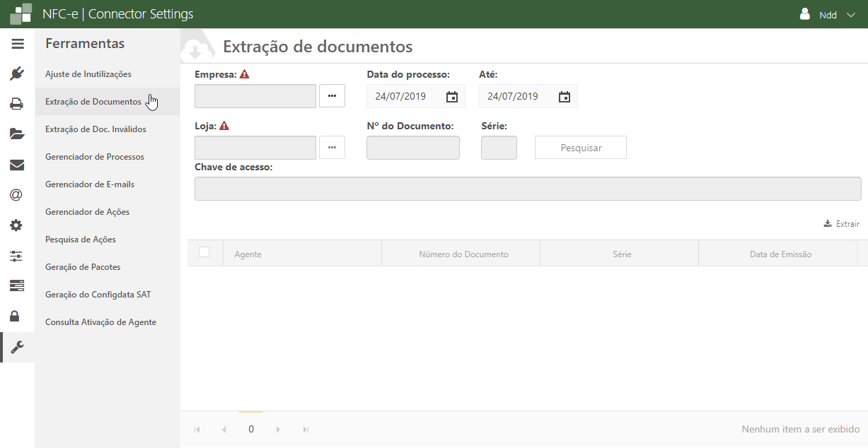 Acesse o e-Connector Settings e na área de Ferramentas, clique em Extração de Documentos. A seguinte tela é apresentada: