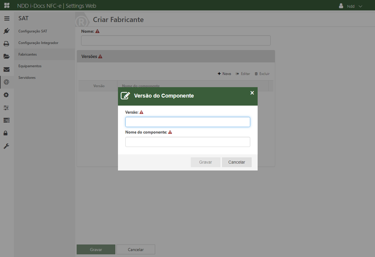 Deve ser cadastrado os componentes, juntamente das versões de cada componente que será utilizado pela contingência SAT.