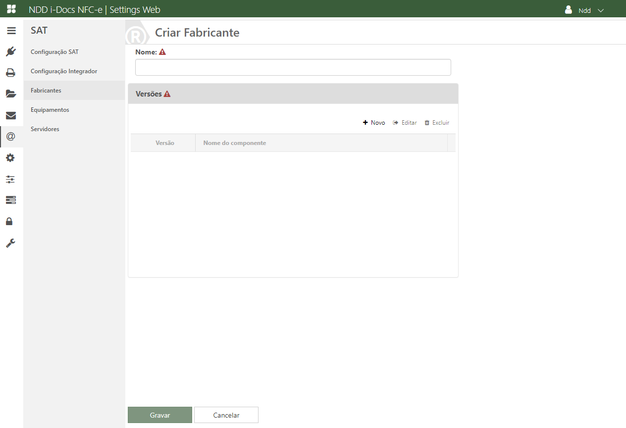 Para cadastrar um novo fabricante clique em +Novo. Será exibida a tela para cadastro dos dados, preencha-os conforme descrito abaixo.