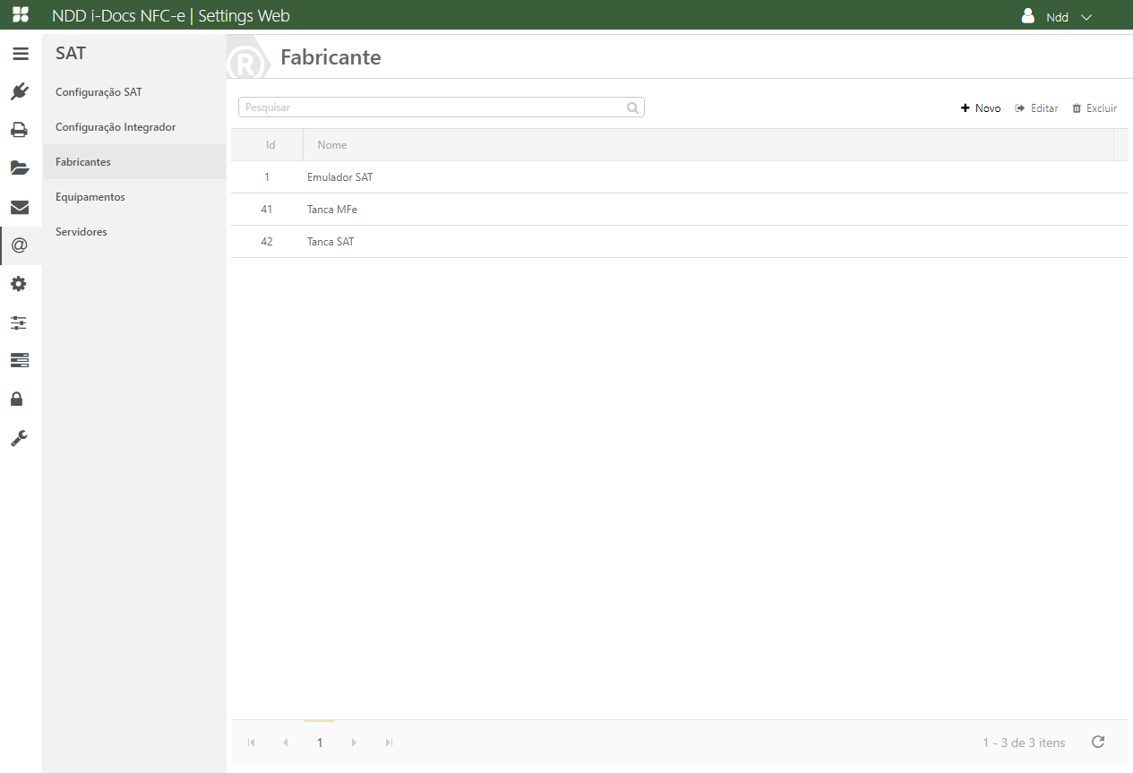 Acesse o e-Connector Settings e na área de configurações, clique em Fabricantes SAT. A seguinte tela é apresentada:
