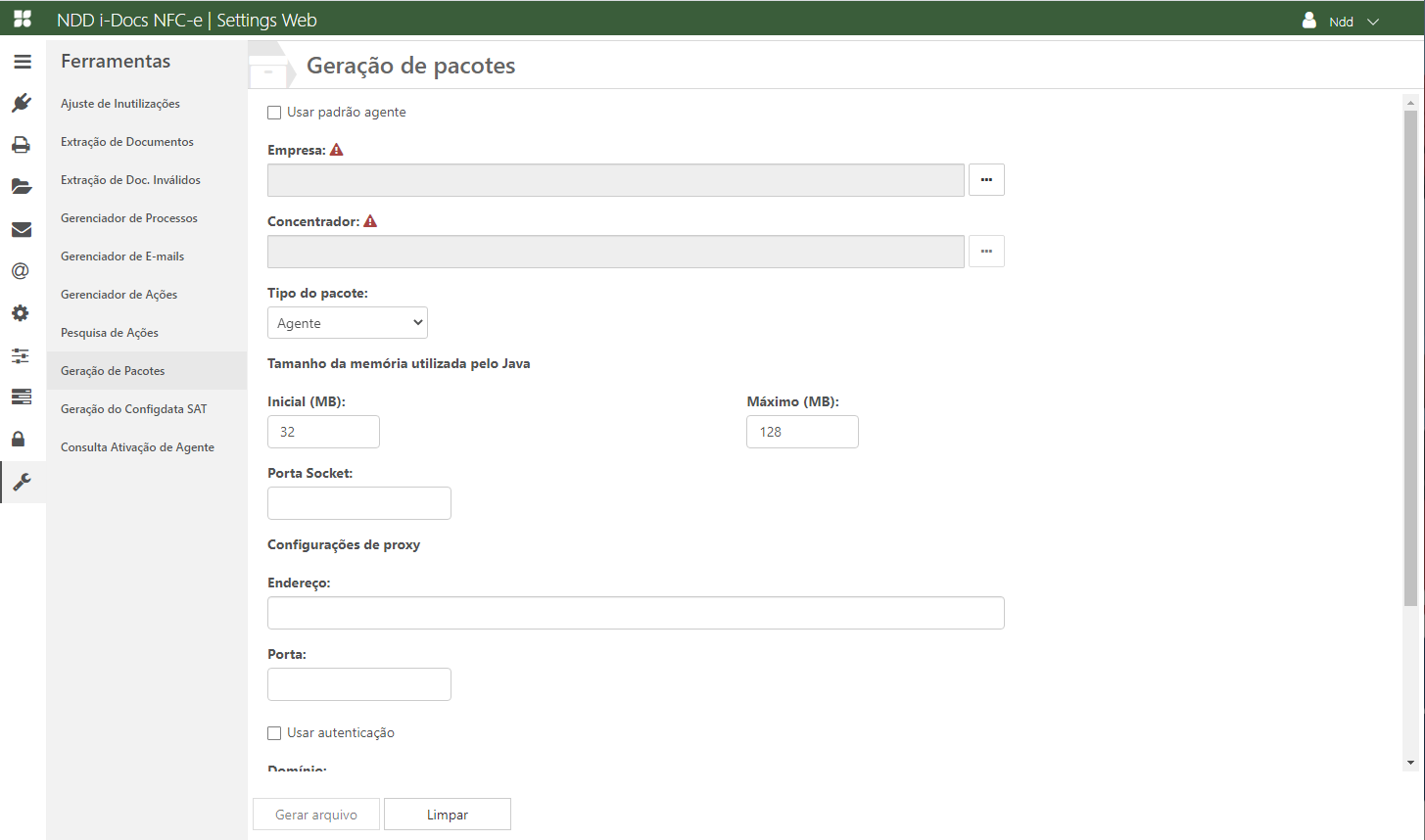 Acesse o e-Connector Settings e na área de Ferramentas, clique em Geração de Pacotes. A seguinte tela é apresentada: