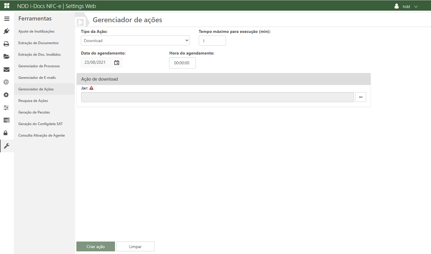 Acesse o e-Connector Settings e na área de Ferramentas, clique em Gerenciador de Ações. A seguinte tela é apresentada: