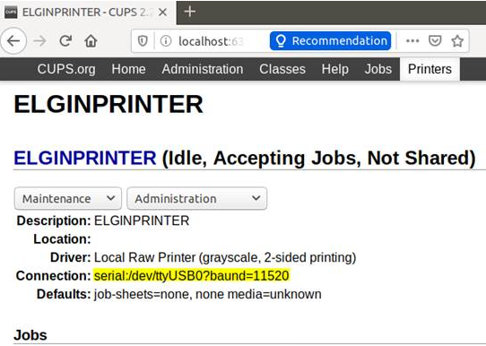 ✓ Deve ser executado o comando: /usr/sbin/lpadmin –p ELGINPRINTER –E –v serial:/dev/ttyUSB0?baund=11520