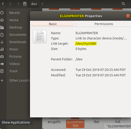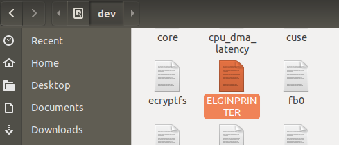 Ao enviar um print-adic com a configuração <PrinterName>port=ELGINPRINTER</PrinterName>, a impressão irá funcionar corretamente, pois existe esta porta na pasta /dev.