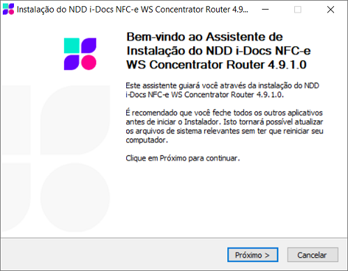 Execute o arquivo de instalação do WS Concentrator Router NFC-e disponibilizado pela NDDigital. Você também pode fazer o download dos instaladores acessando o site da NDDigital, efetuando seu cadastro de usuário. Para isso, acesse http://ndd.com.br/.