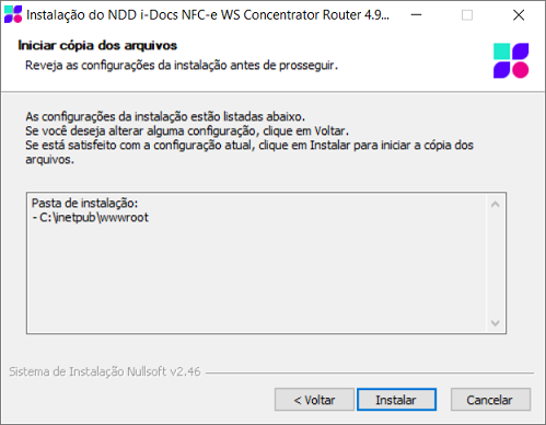 As configurações realizadas são listadas antes de iniciar a instalação. Reveja as configurações, caso deseje alterar alguma delas, clique em voltar. Se todos os parâmetros configurados estiverem de acordo com o desejado, clique no botão Instalar para iniciar a instalação do produto.