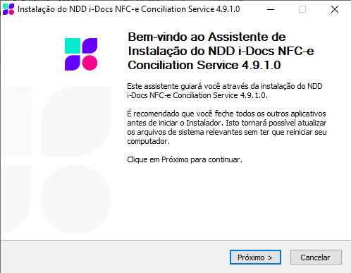 O instalador do Conciliation Service NFC-e faz a verificação de todos os componentes que são pré-requisitos para o seu funcionamento, caso não detecte algum, apresenta mensagem informando que é necessário instalar o pré-requisito para iniciar a instalação. Após todos os pré-requisitos conferidos, é permitido instalar o Conciliation Service NFC-e. Será exibida a tela inicial do instalador, clique em Próximo: