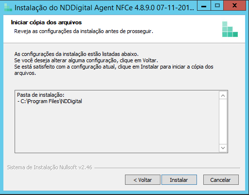 •Iniciar Cópia dos Arquivos: As configurações realizadas são listadas antes de iniciar a instalação. Reveja as configurações, caso deseje alterar alguma delas, clique em voltar. Se todos os parâmetros configurados estiverem de acordo com o desejado, clique no botão Instalar para iniciar a instalação do produto.