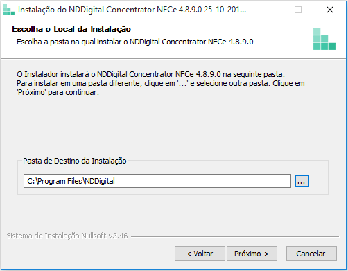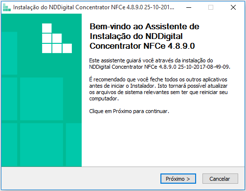Execute o arquivo de instalação do Concentrador disponibilizado pela NDDigital. Você também pode fazer o download dos instaladores acessando o site da NDDigital, efetuando seu cadastro de usuário. Para isso, acesse http://ndd.com.br/.